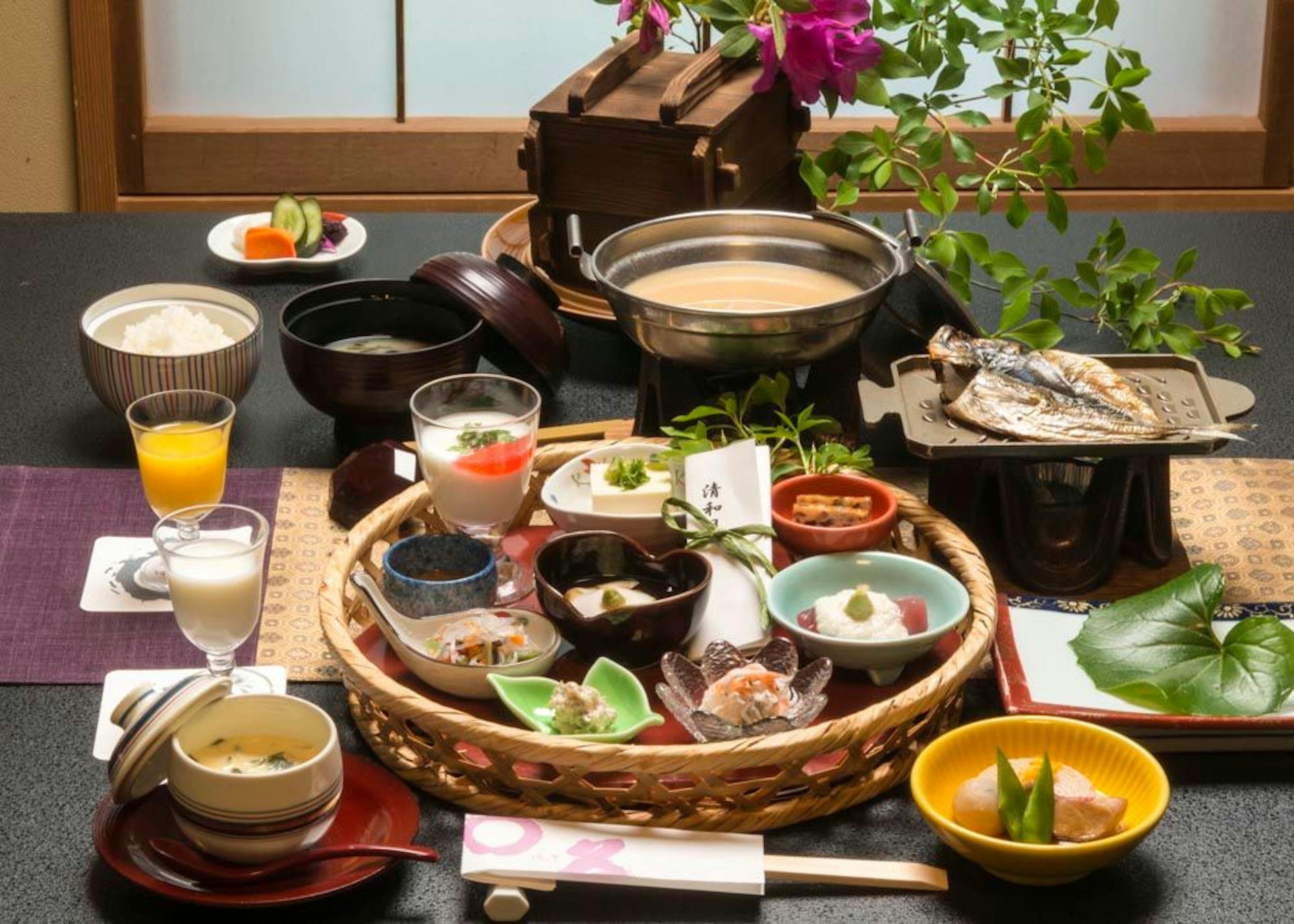 四季折々の懐石料理は好評で、夕食は彩り豊かに、朝食は食欲をそそる香り豊かな食事となっています。