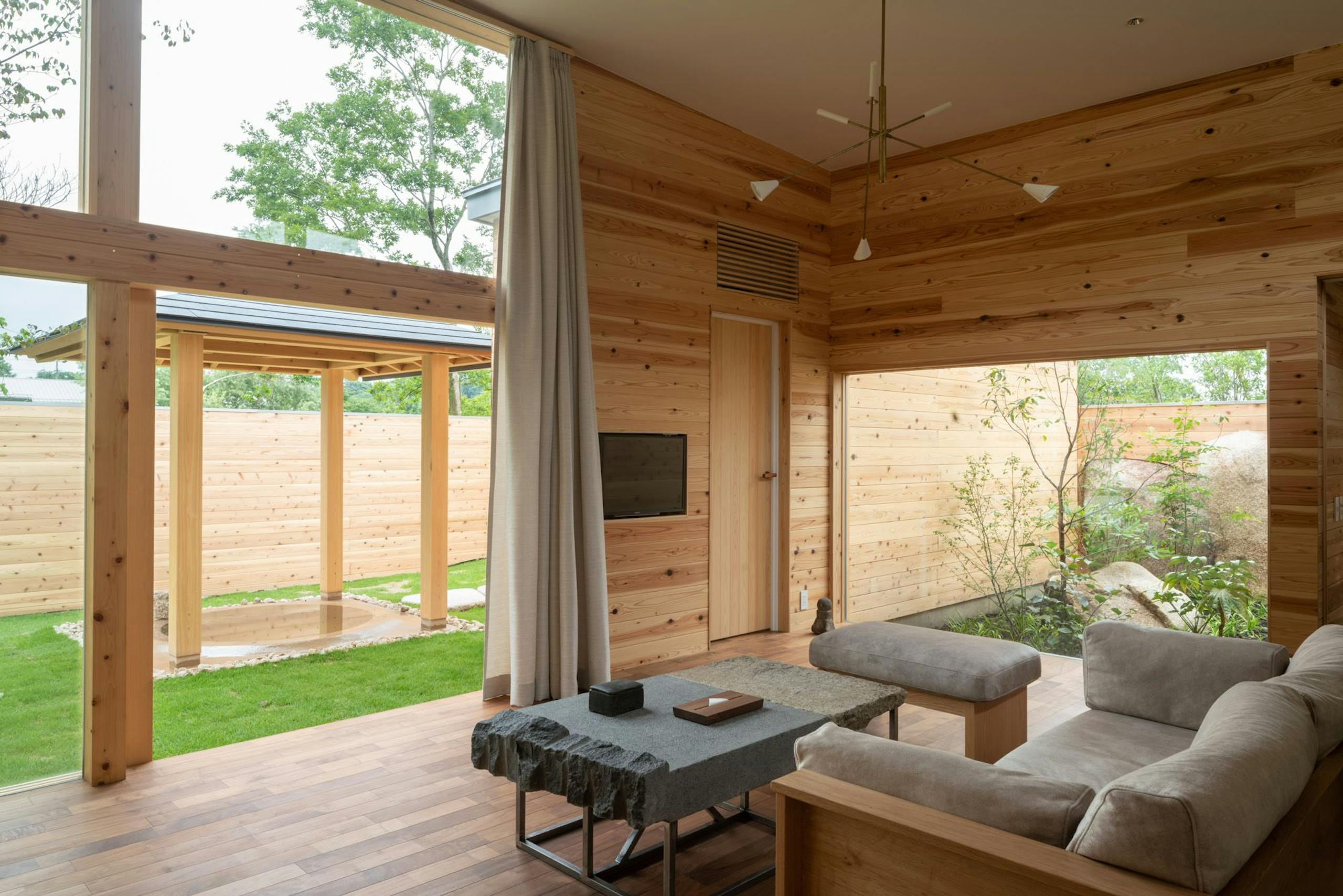 12棟のヴィラに共通するのは、源泉掛け流しの露天風呂をはじめ、居間・和室・寝室が完備されていること。