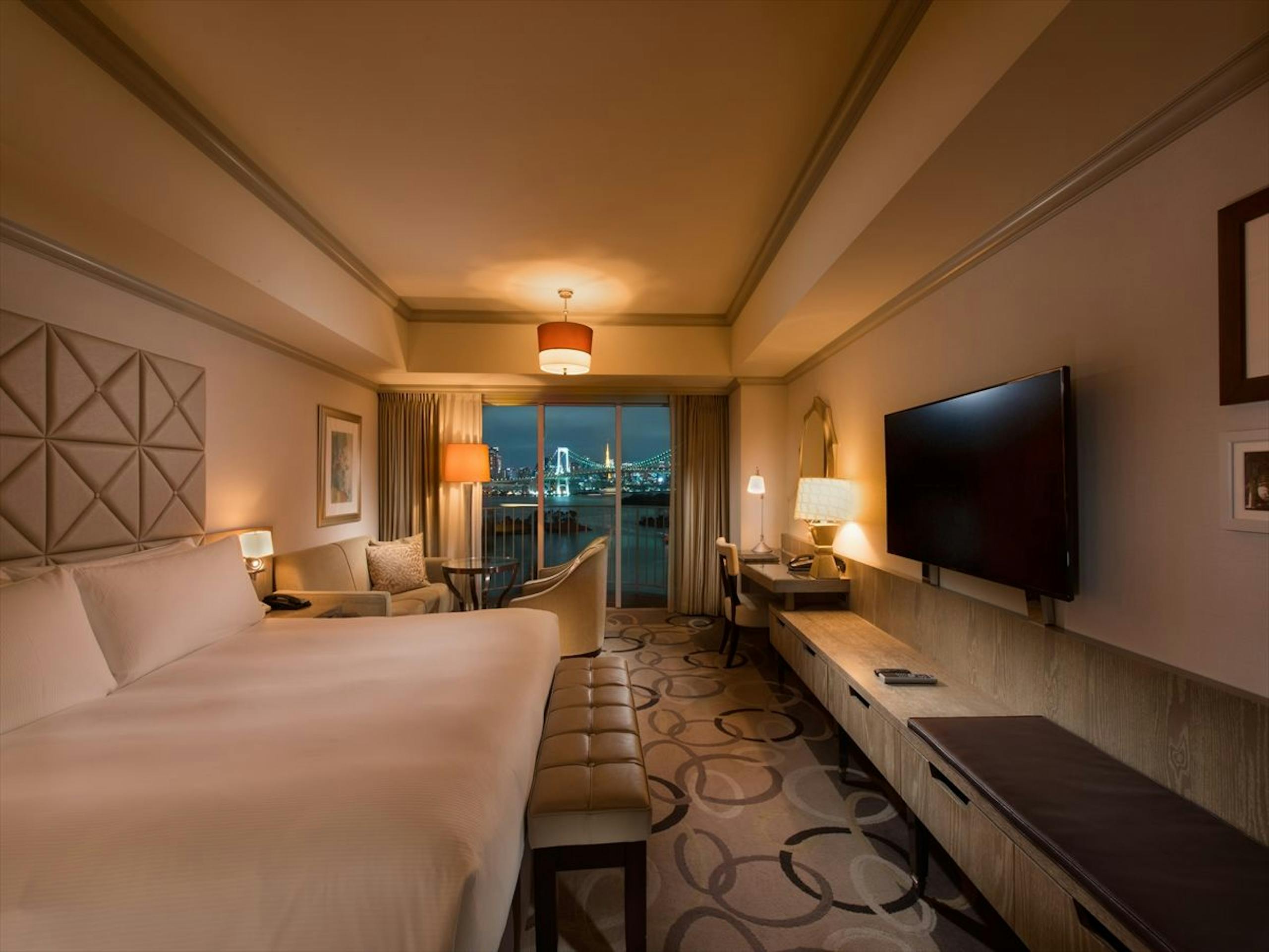こちらの客室は、レインボーブリッジや美しい夜景も楽しめる「デラックスキング」。