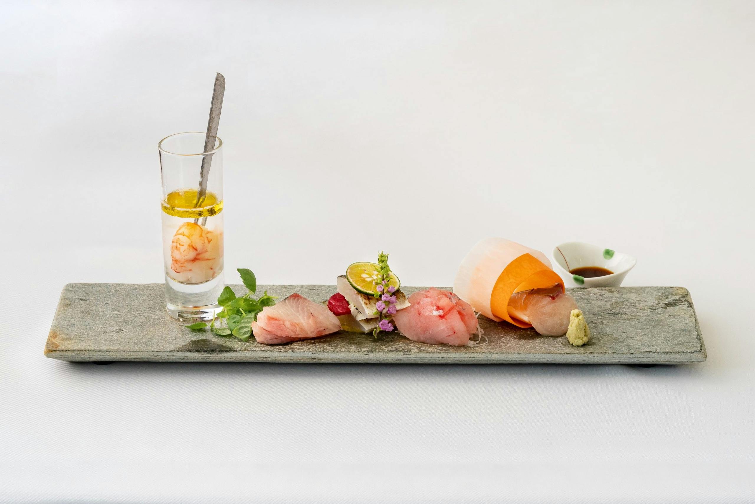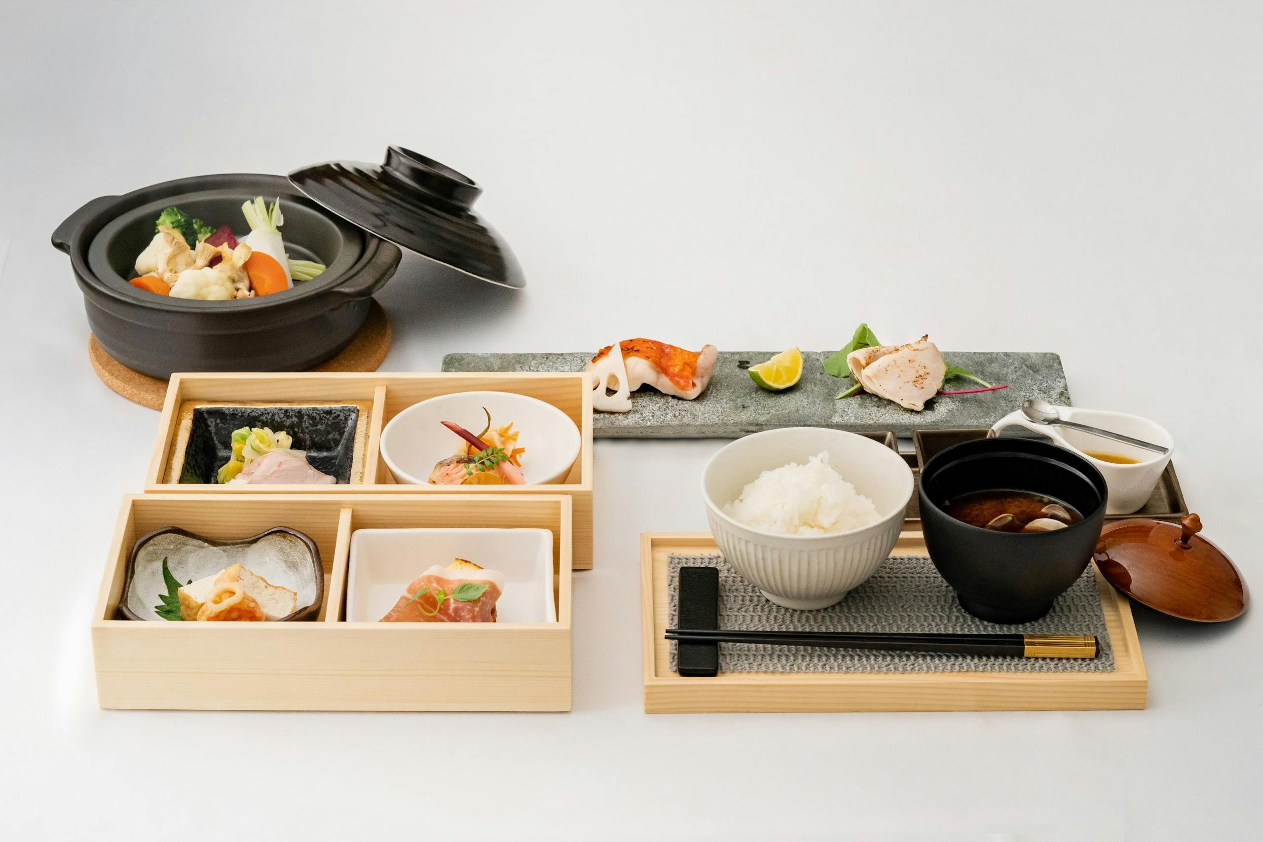 夕食には、旬の食材を取り入れた和食にイタリアのエッセンスも加えた全10品の創作コースを用意。