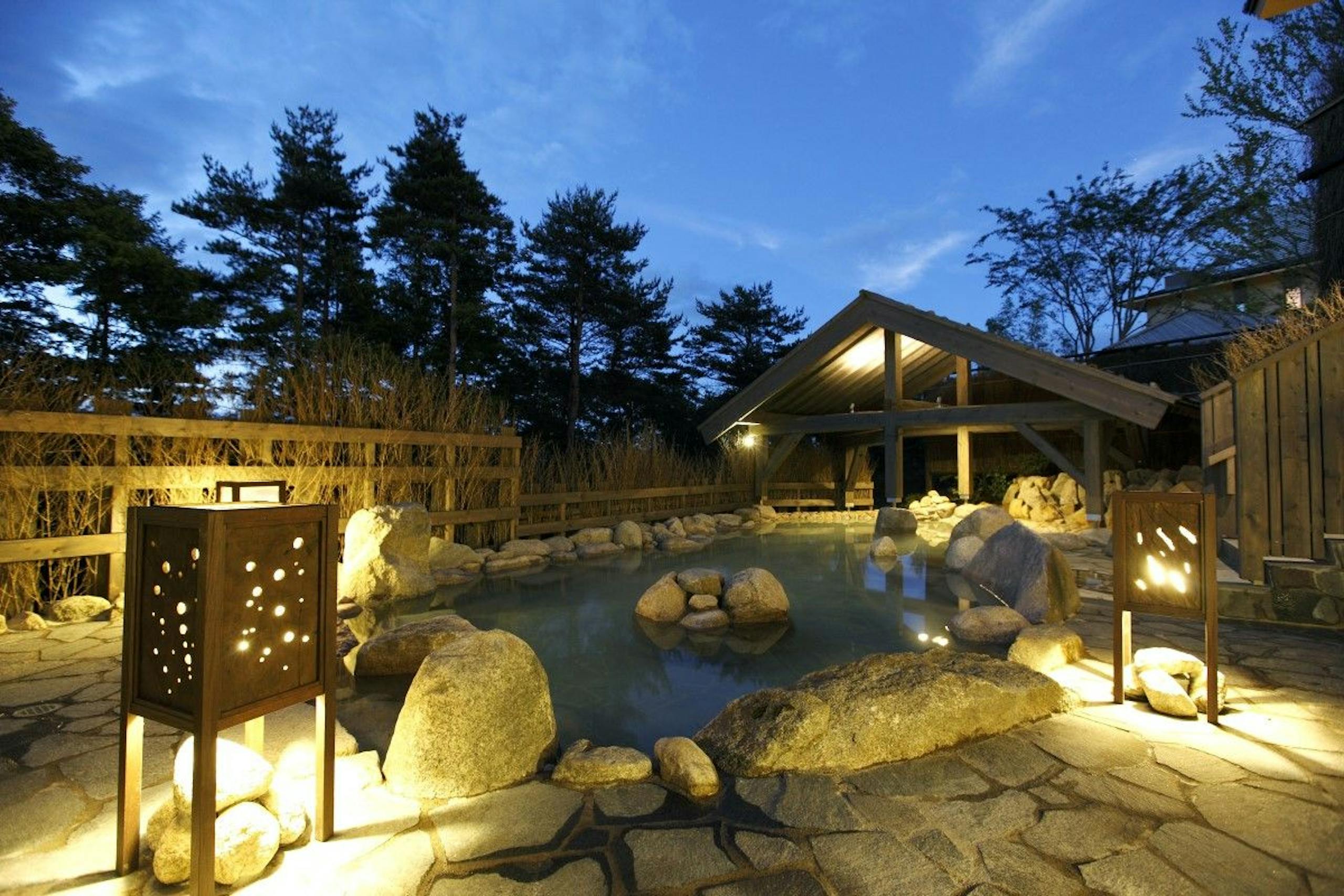 大浴場は浅間山が一望できる前面開放の半露天風呂。100%源泉掛け流しの温泉で、ピリッとした肌触りが特徴の「万代鉱源泉」を使用しています。