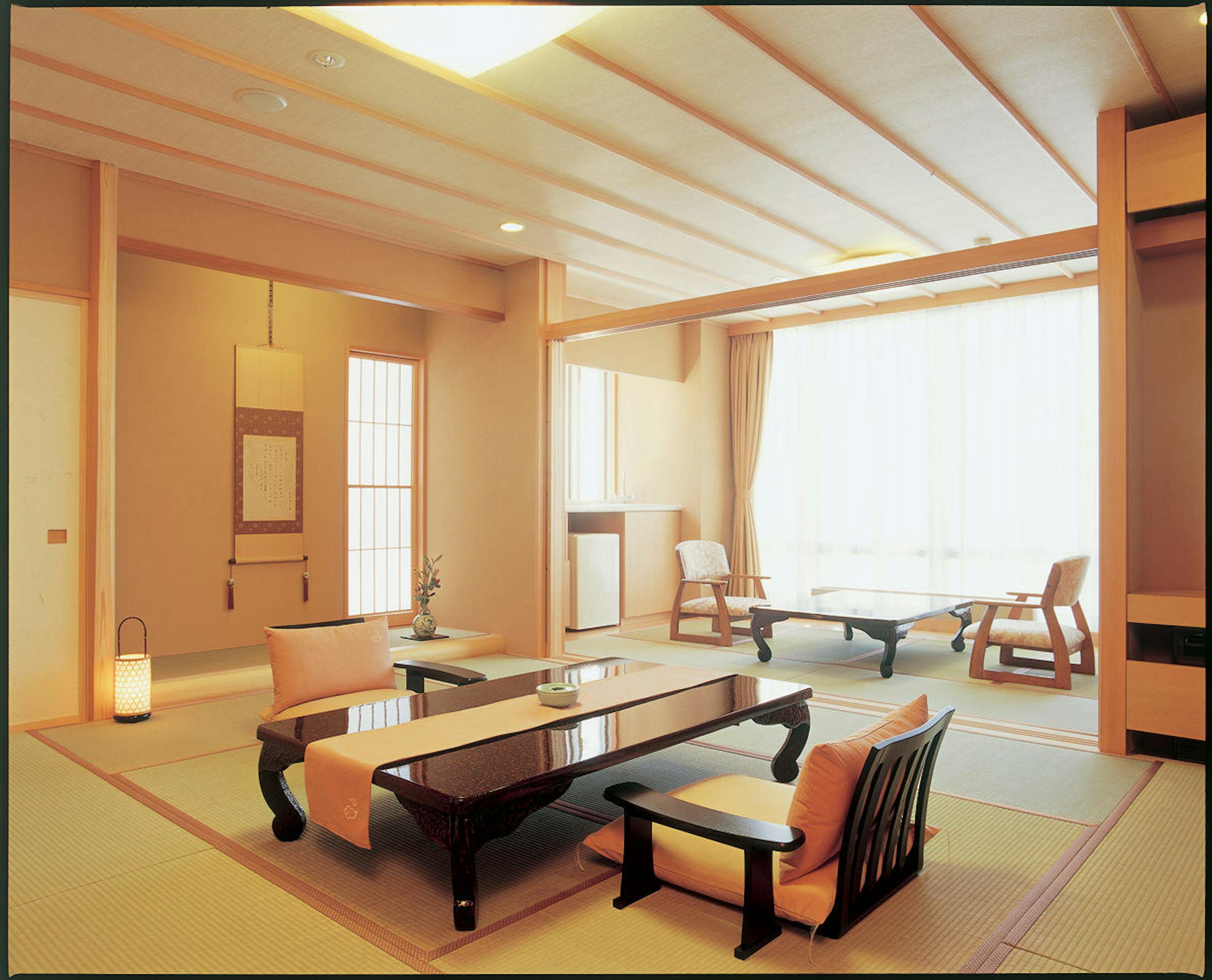 客室は和の落ち着きとモダンなインテリアが特徴的。標準和室でも10〜12畳の広さがあるので、のびのびと過ごすことができますよ。
