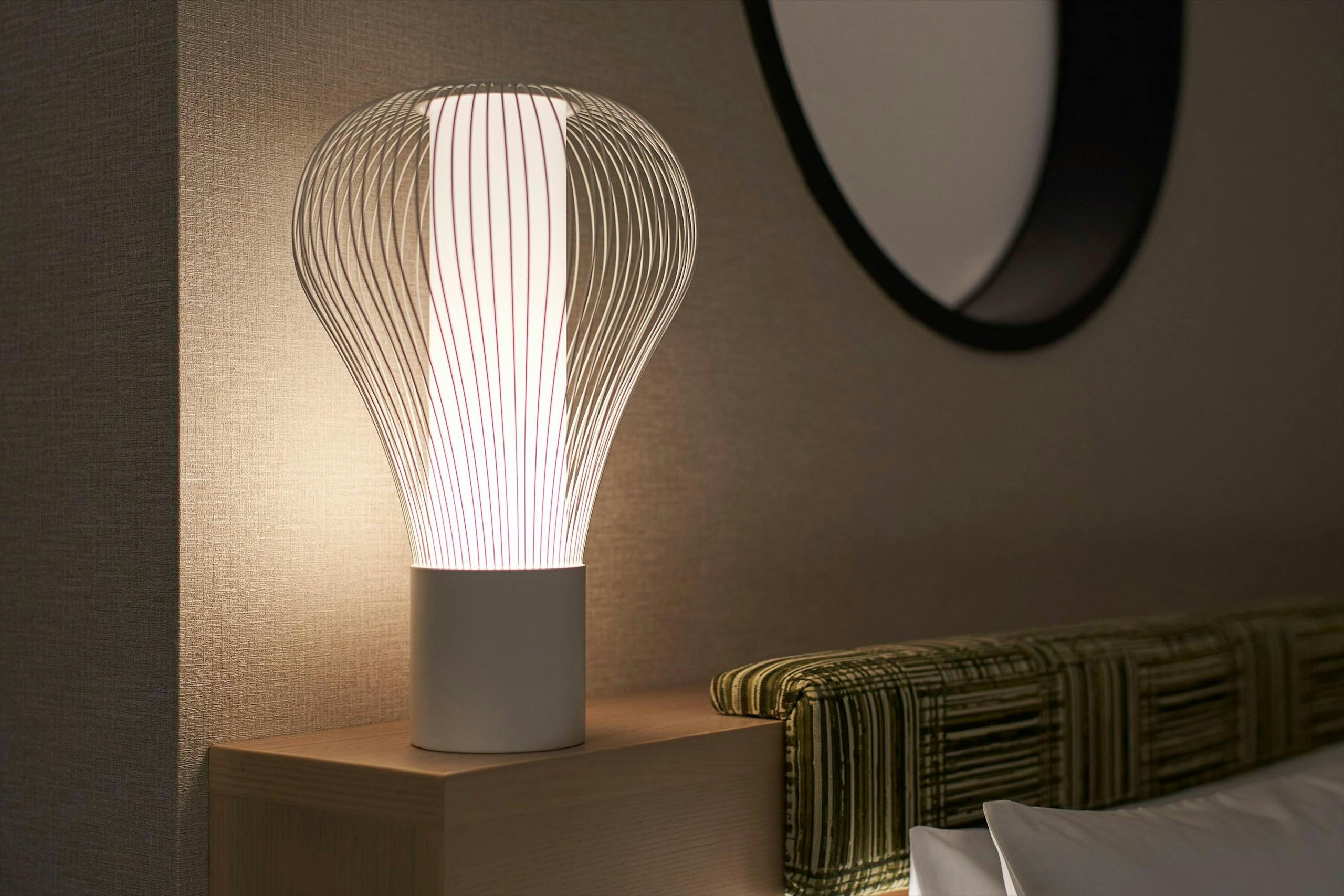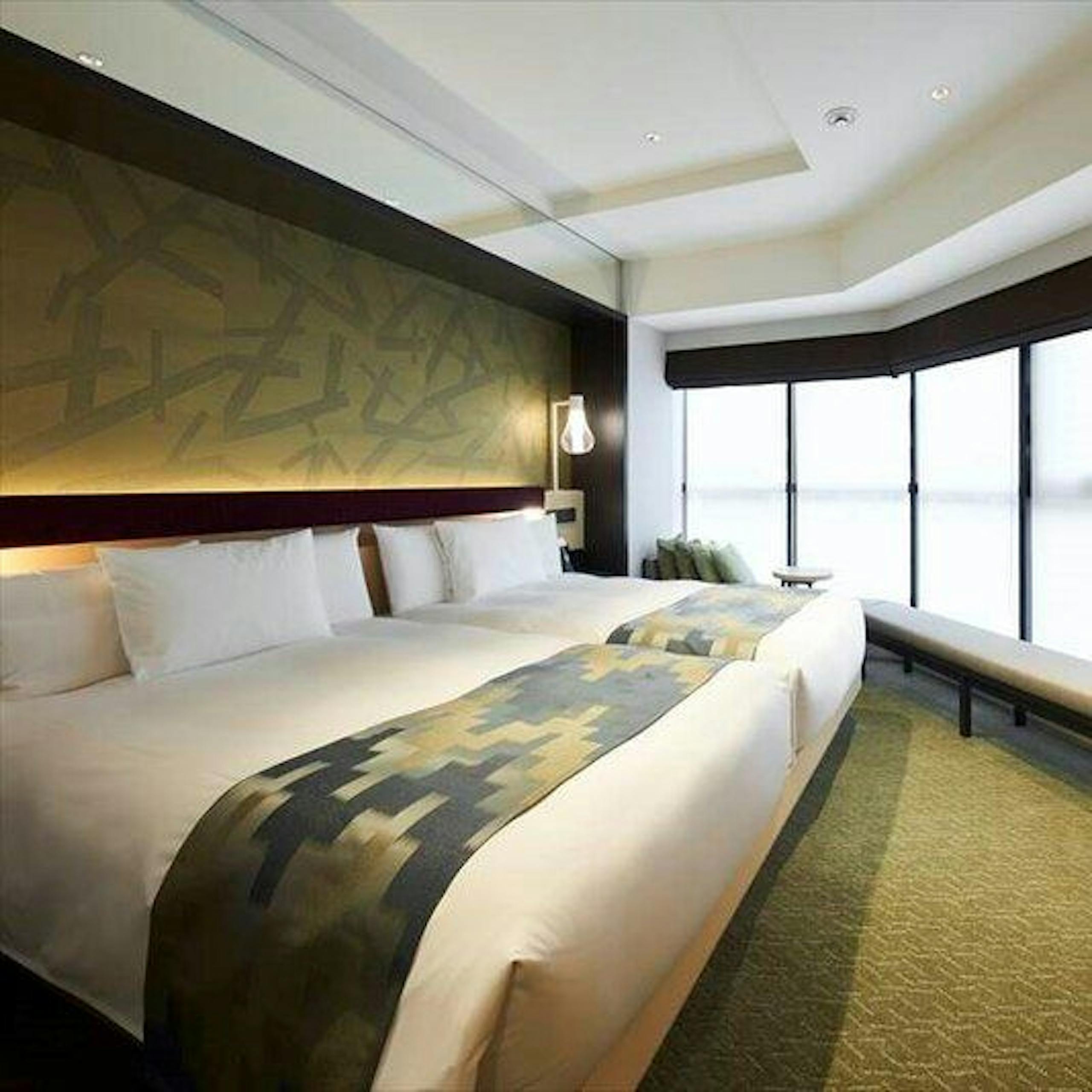 枕元の照明は「茶筅(ちゃせん)」をモチーフにしたデザインで、まるで茶室のような「円窓」もホテルのテーマにピッタリ。
